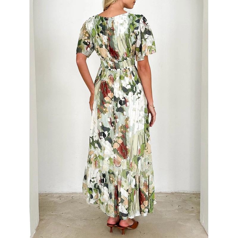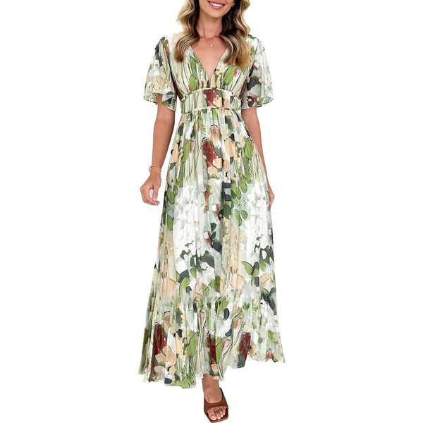 Flessibili Womens V Neck Flutter Sleeve Boho Midi Dress Summer Wedding Guest Beach Party Long Dresses Green Abstract Large