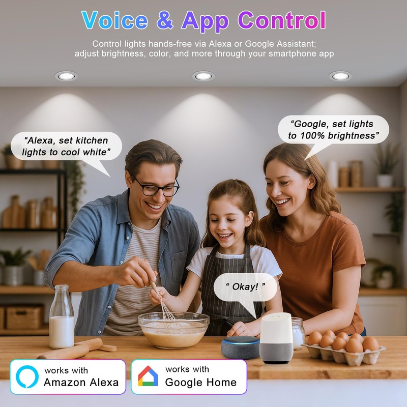 - 【Smart App & Voice Control】Control the 2 inch smart recessed LED lights through the Smart Life app—download it, follow the manual to complete setup and auto‑connect, and use group control to manage lighting throughout your home. These app controlled LED recessed lighting fixtures also work with Alexa and Google Home for hands‑free voice control to adjust brightness, switch lights, or change colors. Supports 2.4 GHz WiFi and Bluetooth for quick response—ideal for smart homes