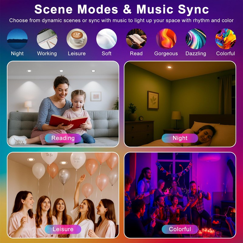 - 【Dimmable & RGB + CCT 2700K-6500K】Create the perfect ambiance with this CRI80+ smart recessed lighting. Enjoy 1%–100% dimming, 16 million RGB colors, and adjustable white light from 2700 K to 6500 K. This recessed lighting fixture works as a recessed downlight or retrofit downlight, giving you a versatile dimmable recessed light solution for any room.