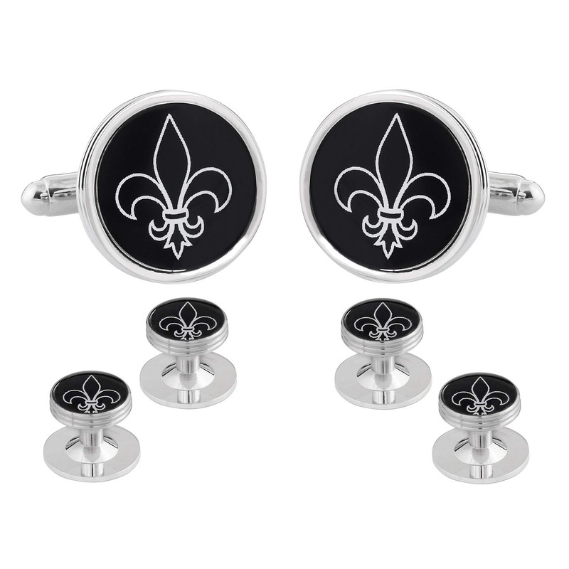 - QUALITY MENS CUFFLINKS & STUDS SET FOR MEN: Fleur De Lis Black Silver Cufflinks Studs Tuxedo Formal Set. Includes 4 studs.