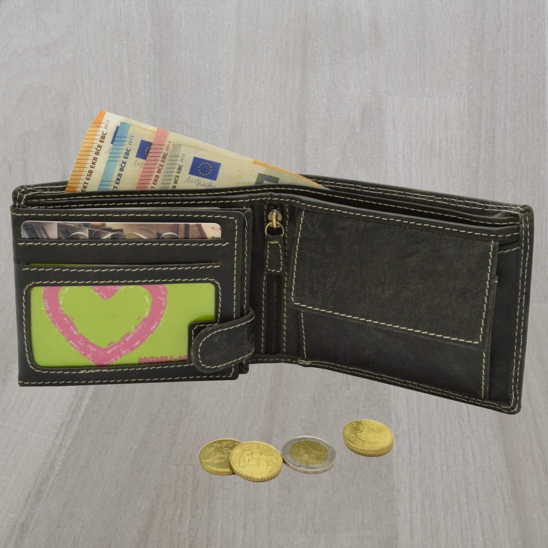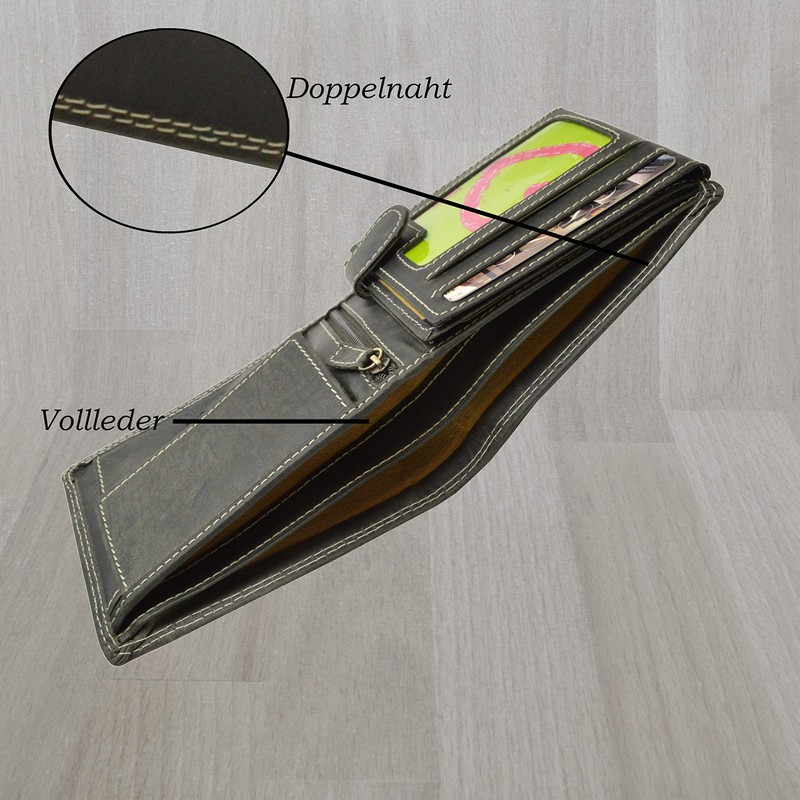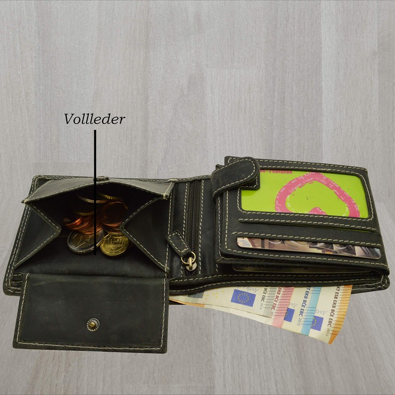 - Features: 2 note compartments (velour leather) - 2 transparent compartments for ID, documents or photos of your loved ones - 8 card slots (bolt closure) - 2 slip pockets/secret compartments inside - 1 zip compartment inside in the middle - 1 coin compartment with press stud closure - double stitching for more stability