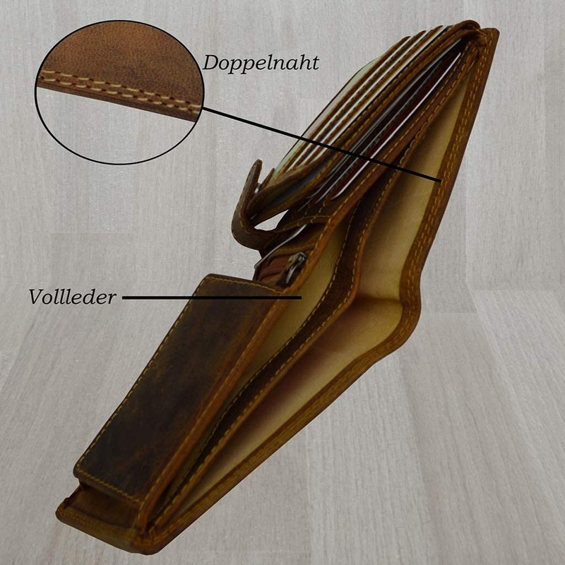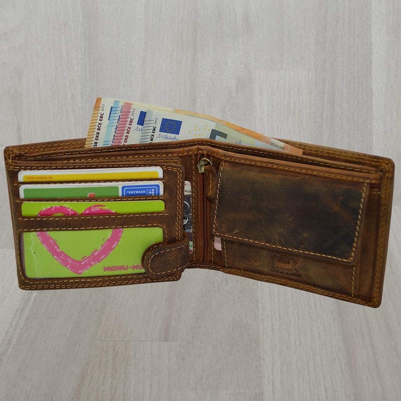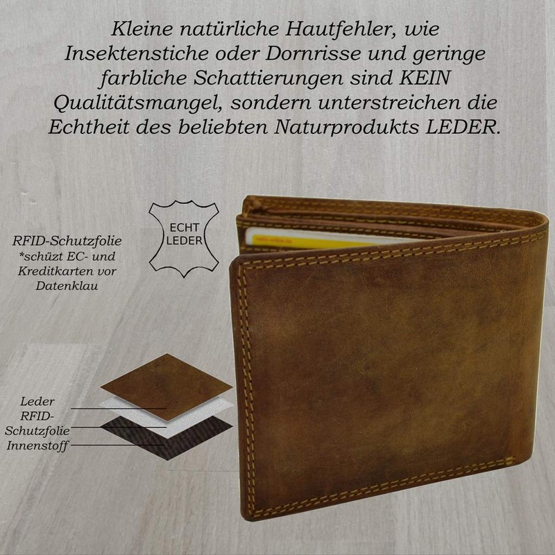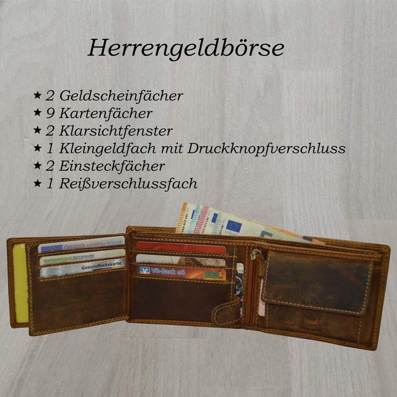 • Features: 2 note compartments (leather) - 9 card slots (latch closure) - 2 transparent compartments for ID, documents or photos of your loved ones - 2 slip-in / secret compartments inside - 1 zip compartment inside in the middle - double stitching for more stability - RFID/NFC protection ➡️ An RFID or NFC protective case should interfere with the signals from readers and thus prevent data theft