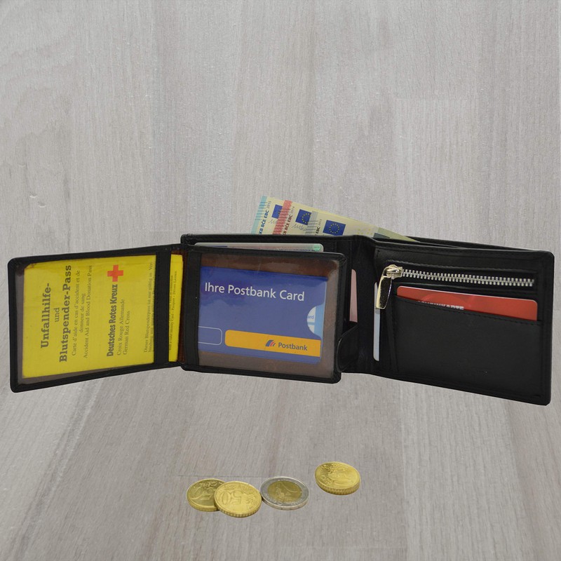 - Features: 2 note compartments, 10 card slots, 2 transparent compartments for ID, documents or photos of your loved ones, 3 slip-in / secret compartments inside, 1 coin compartment with zip, double stitching for more stability