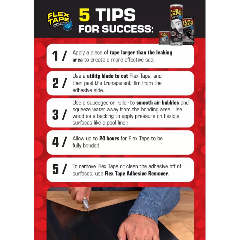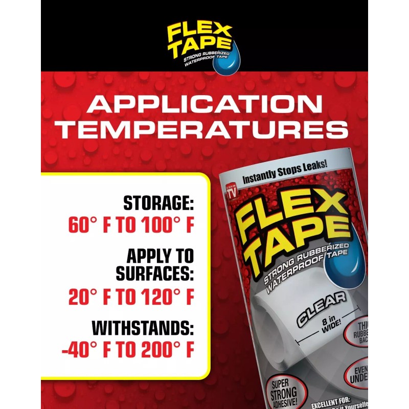 Flex Tape is a super strong adhesive that can patch, bond, seal, and repair almost anything. Even works underwater! Flex Tape's bond increases with time and pressure. Withstands extreme temperature and weather conditions.