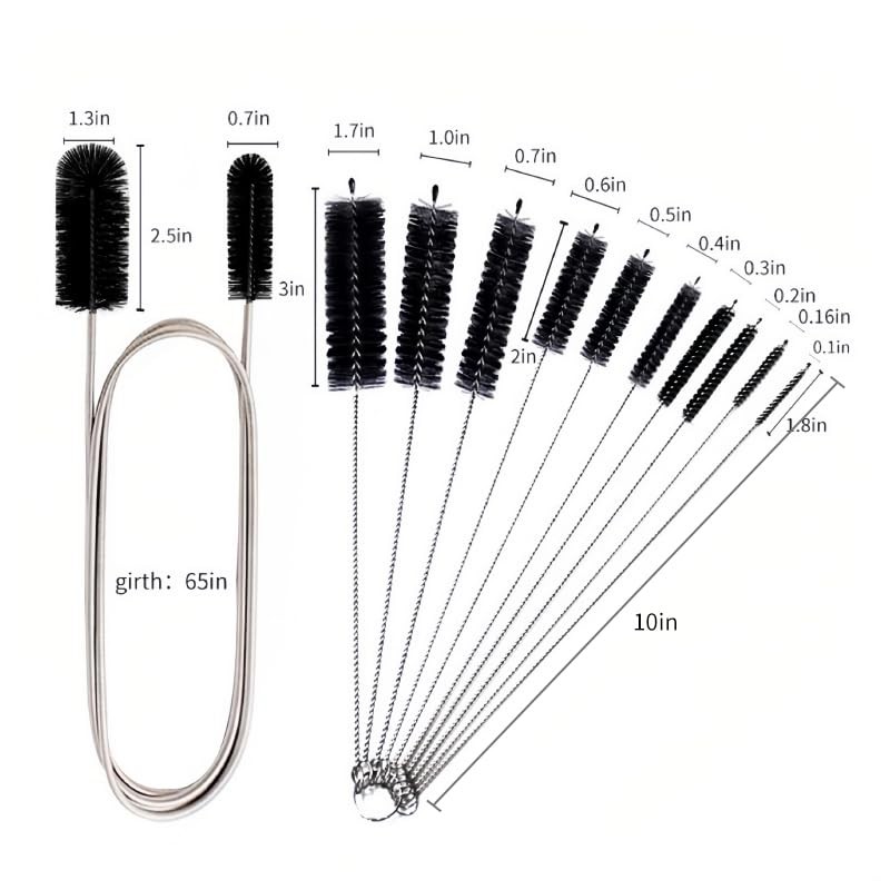 Single-head tube cleaning brush set length:10 in(10 varying diameters:1.7in,1.0in,0.7in,0.6in,0.5in,0.4in,0.3in,0.2in,0.16in,0.1in).