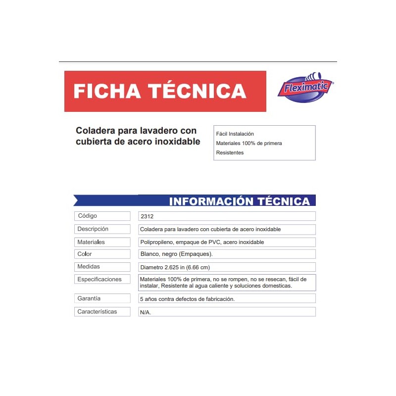 Fleximatic 2312 Coladera con cubierta de Acero Inoxidable para lavadero