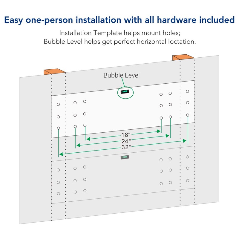 - Easy one-person installation with all hardware included: Installation Template helps mount holes; Bubble Level helps get perfect horizontal location