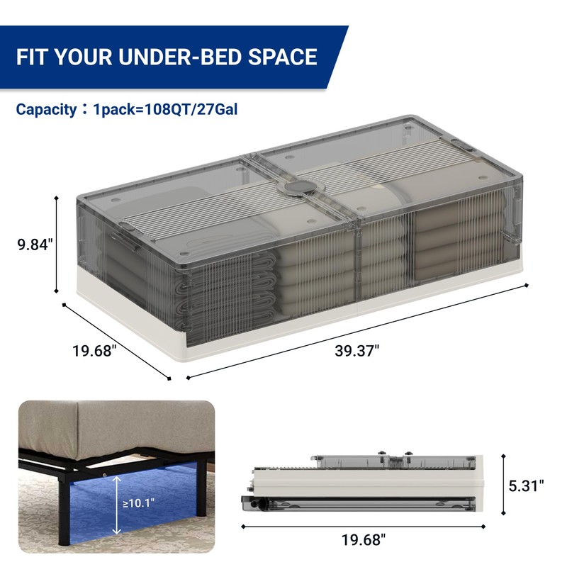 - LARGE STORAGE CAPACITY: These under bed storage,39.37"(L) x 19.68"(W) x 9.84"(H), offers a generous capacity of up to 27Gal, allowing safe storage of items such as clothes,books and shoes,thereby accommodating your larger storage needs. Enhance your under-bed space with our under-bed storage,an ideal space-saving solution perfectly suited for small bedrooms and apartments.
