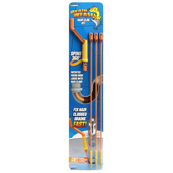 FlexiSnake Drain Weasel Sink Snake Hair Clog Remover Tool Kit, Sink, Pipe, Bathroom, Bathtub Drain Cleaner, 18-inch Long, Flexible, Made in The USA, 3 Pack Wand Refills and Removable Handle