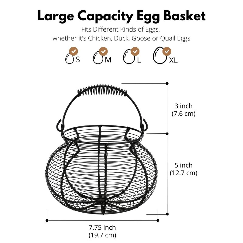 Flexzion Egg Collecting Basket Round Wire Basket Chicken Egg Holder Black Farmhouse Rustic Decorative Egg Storage, Chicken Egg Basket for Gathering Fresh Eggs, Fruits, and Vegetables, with Handle