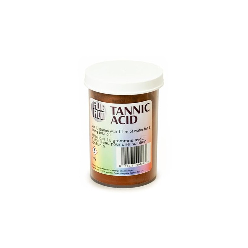 Explore the creative possibilities with the Flic Film Tannic Acid Toner, a 1.8 oz (50g) solution designed to enhance your cyanotype processing. This versatile chemical, known for its low acidity, serves as both a reducer and mordant, allowing you to achieve a stunning array of shades on your prints. Whether you're aiming for rich browns, deep purples, or striking blacks, this toner offers the flexibility to transform your artistic vision into reality. To use, simply mix the toner with warm water and apply it directly to your print after the bleaching stage. Perfect for photographers and artists seeking to add depth and character to their cyanotype creations, the Flic Film Tannic Acid Toner is an essential tool for innovative printmaking.