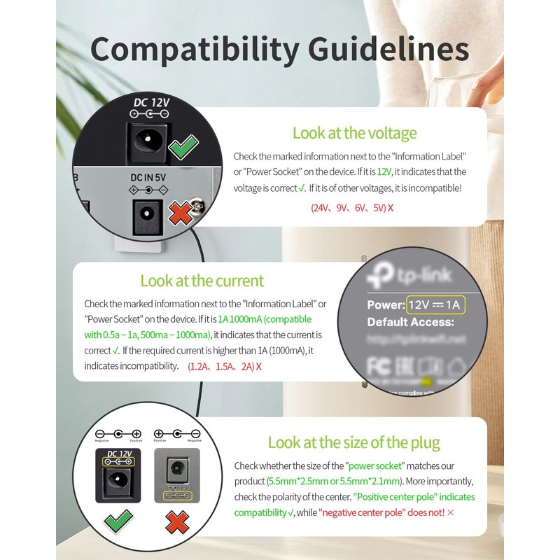 - [Power Specs]: Input 100V-240V 50/60Hz; Output: 12V 1A. Output adaptor Self-Adapting Barrel jack size: 5.5mm x 2.1mm (applicable 2.5mm) positive (+) center.