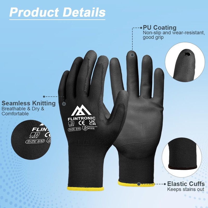 1. The palm and fingertips of the Flintronic work gloves are coated with non-slip PU, which is non-slip and wear-resistant.
