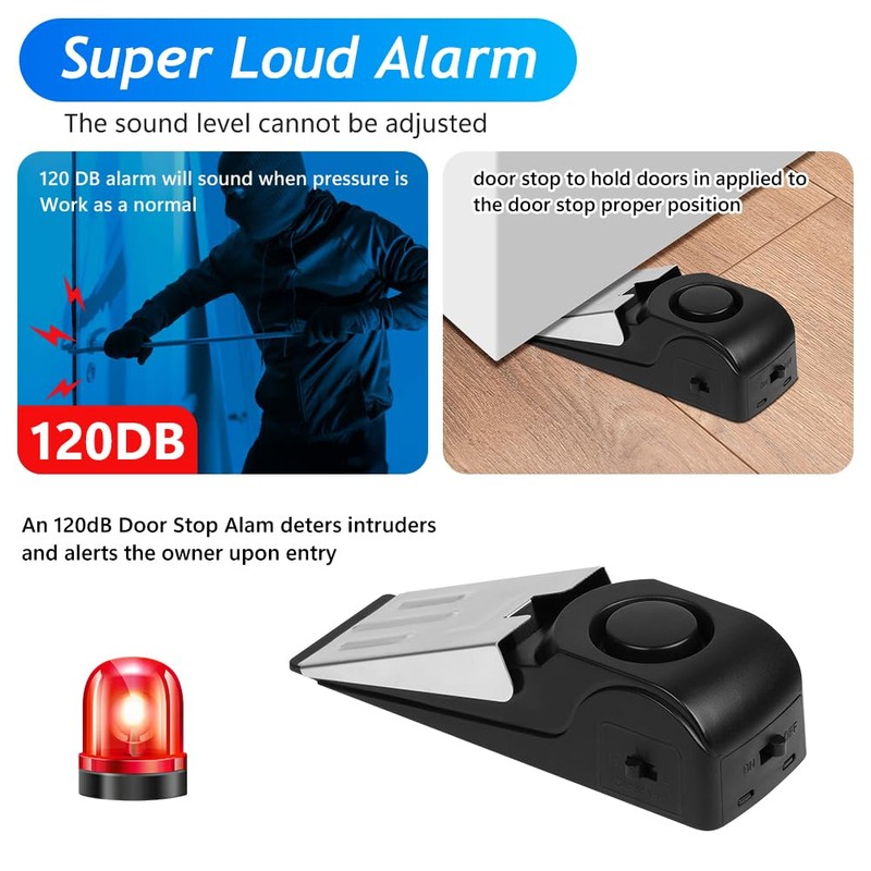 - đăSAFETY GUARDăDoor stop alarm with 120DB siren, only 1 9V battery (not provided). It is convenient to carry and protect your safety whether you are at home or traveling. Once someone opens the door, the door stop alarm will sound first, they will scare away bad guys, effectively prevent burglary or break-in, and help wake you up and give you time to seek help.