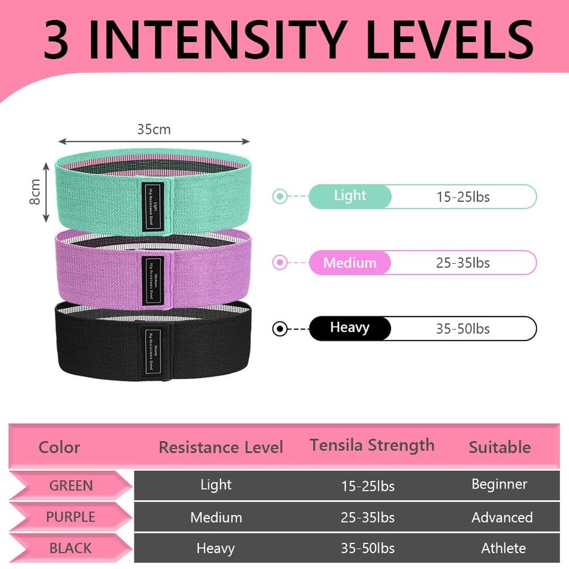 - 💚💜🖤【3 Resistance Levels】The fabric resistance band set has 3 resistance levels: light, medium, and heavy. Each color reflects the resistance level: green for 15–25 lbs, purple for 25–35 lbs, and black for 35–50 lbs. Whether you are a pro or a beginner, fitness bands can meet your needs.