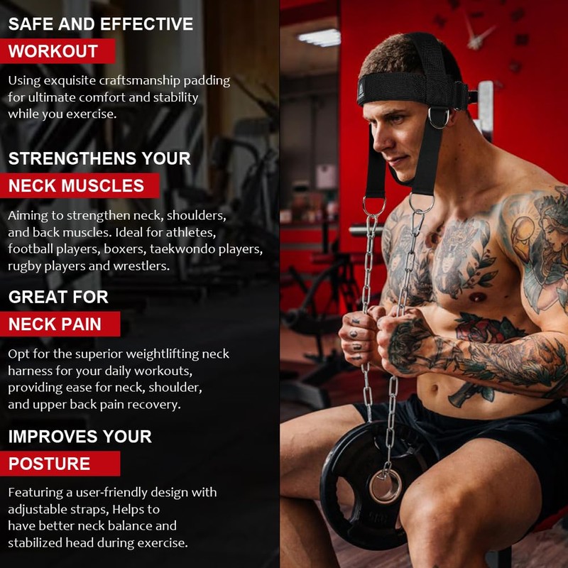 - đăAdjustable Chin Strap and Head StrapăThis neck trainer comes with adjustable head strap and neck strap, which can be adjusted according to your needs. Equipped with 4 D-rings to link the steel chain to the D-ring, suitable for various neck exercises.