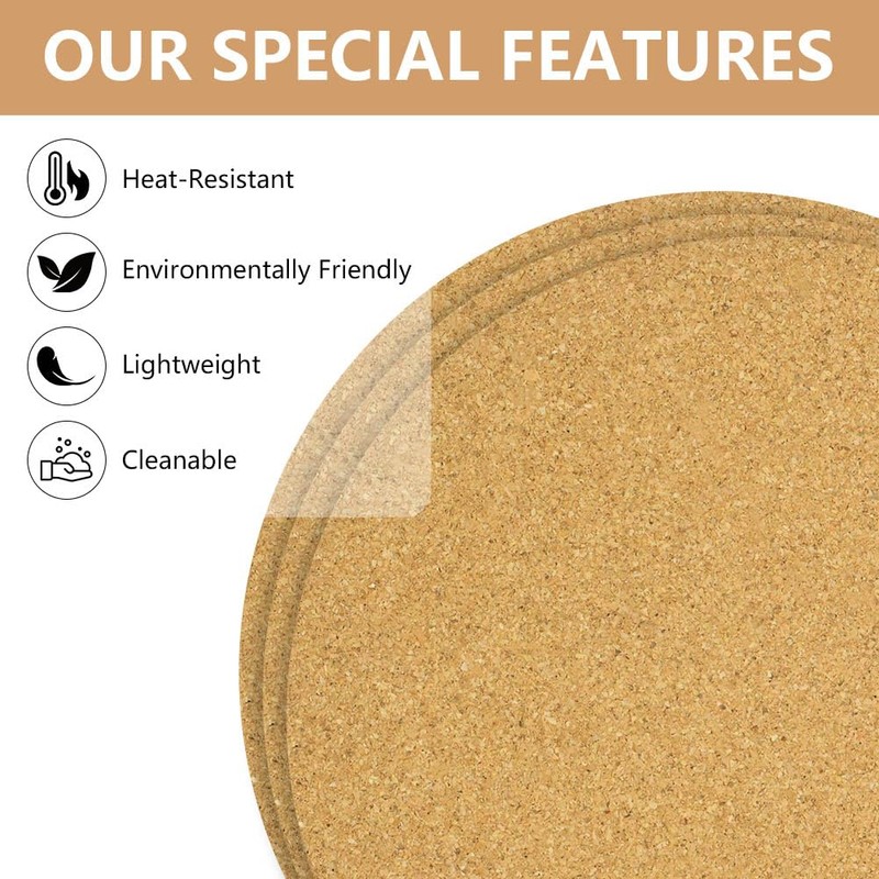 - High-quality materials: cork mats are made of high-quality, environmentally friendly cork, which has good flexibility and durability, withstands a certain pressure and friction and does not break easily. Heat resistant and moisture resistant, very suitable for storing hot and cold drinks. Non-toxic and recyclable, environmentally friendly and lightweight.