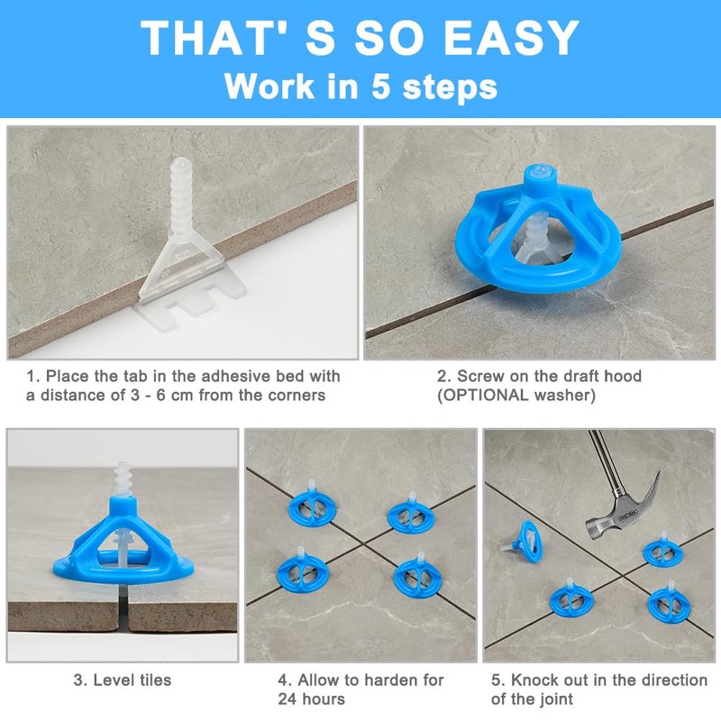 - Easy to use: the tile levelling is easy to use. Simply screw the nut onto our tile leveling screw base to easily align the tiles. Simply remove it after 24 hours. The sturdy nut can be reused, but the screw base has a predetermined breaking point and is a disposable item.