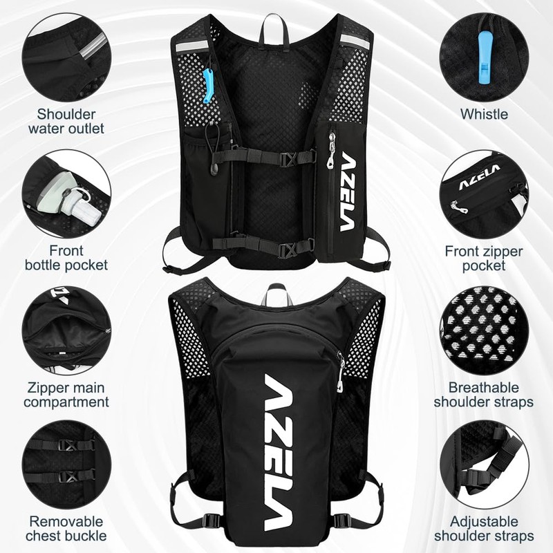 - 【Practical & Adjustable】This running vest features a zippered main compartment, a water bottle pocket and zippered pockets on the shoulder straps for easy placement of spare water bottles and personal items such as mobile phones, keys, tissues, towels, etc. The shoulder straps and chest of the backpack are designed to be adjustable, making it more comfortable and convenient for you to use, and making the backpack fit you better.