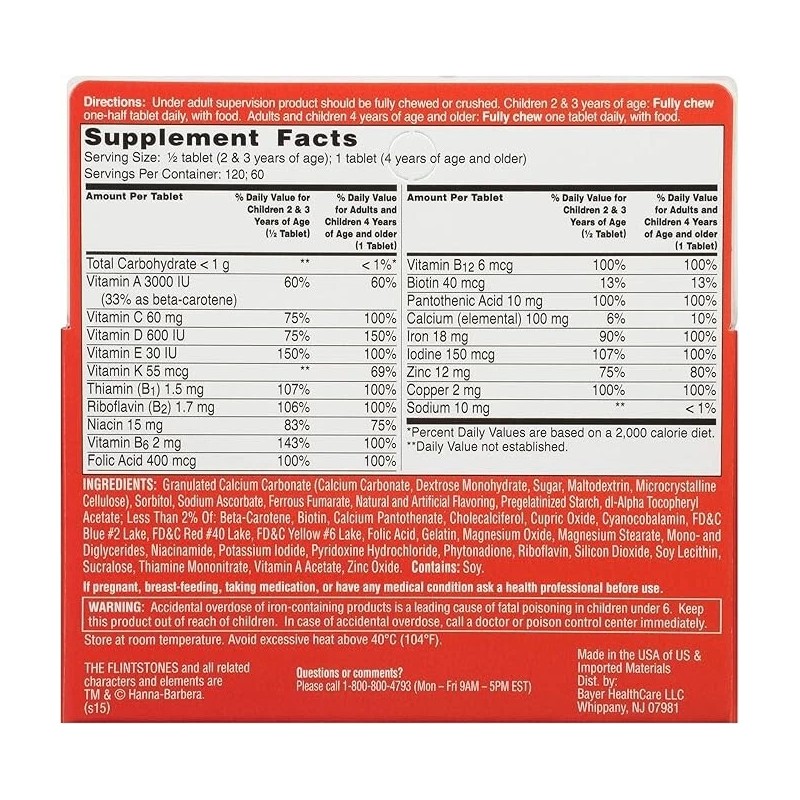 Active Ingredients: Per Tablet: Total Carbohydrate < 1 g; Vitamin A (33% as Beta-Carotene) 3000 IU; Vitamin C 60 mg; Vitamin D 400 IU; Vitamin E 30 IU; Thiamin (B1) 1.5 mg; Riboflavin (B2) 1.7 mg; Niacin 15 mg; Vitamin B6 2 mg; Folic Acid 400 mcg; Vitamin B12 6 mcg; Biotin 40 mcg; Pantothenic Acid 10 mg; Calcium (Elemental) 100 mg; Iron 18 mg; Phosphorus 100 mg; Iodine 150 mcg; Magnesium 20 mg; Zinc 12 mg; Copper 2 mg; Sodium 10 mg; Choline 38 mg; Sorbitol; Dicalcium Phosphate; Magnesium Phosphate; Choline Bitartrate; Sodium Ascorbate; Ferrous Fumarate; Gelatin; Natural and Artificial Flavors (Including Fruit Acids); Pregelatinized Starch; Vitamin E Acetate; Stearic Acid; Carrageenan; Hydrogenated Vegetable Oil (Soybean, Castor); Magnesium Stearate; Zinc Oxide; Niacinamide; Calcium Pantothenate; FD&C Red 40 Lake; D-Calcium Pantothenate; FD&C Yellow 6 Lake; Xylitol; Aspartame** (a Sweetener); Xylitol; FD&C Blue 2 Lake; Cupric Oxide; Pyridoxine Hydrochloride; Sucrose; Thiamine Mononitrate; Vitamin A Acetate; Monoammonium Glycyrrhizinate; Potassium Iodide; Magnesium Oxide.