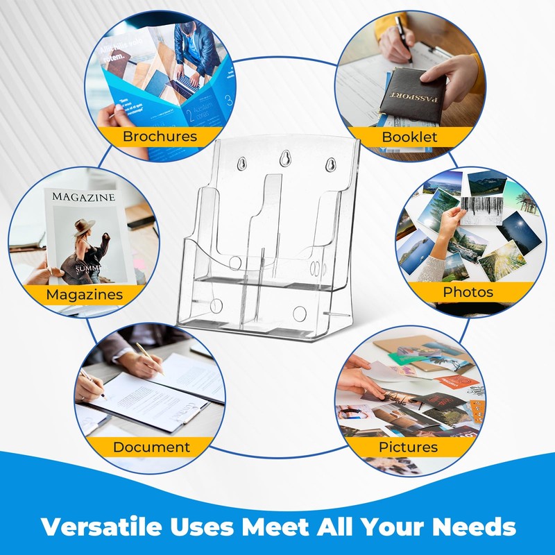 - Easy Installation: This versatile brochure holder can be mounted on the wall or used as a tabletop display. The brochure holder comes with three pre-drilled mounting holes for easy wall installation, as well as a sturdy base for desktop use, offering flexibility in how you choose to display your materials.