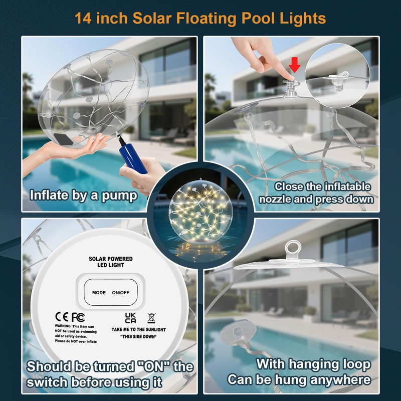 - BeePeep [ Warm White Solar Floating pool Lights ]: Coming with 1pcs Pump, are easy to inflate. 14INCH pool lights is beautiful and sparkling that float above ground pools, noting they look bright illumination in the water that glows all night long, they are large, sturdy, bright, floating pool lights solar powered create a comfortable and romantic ambianc, adding color and personalitye in your party and garden with a romantic sentiment