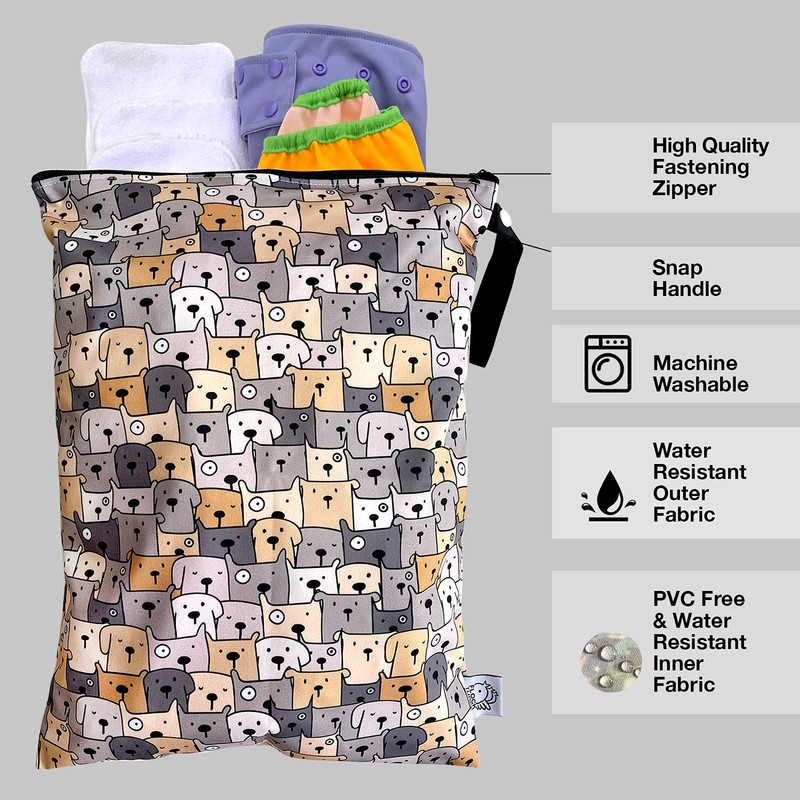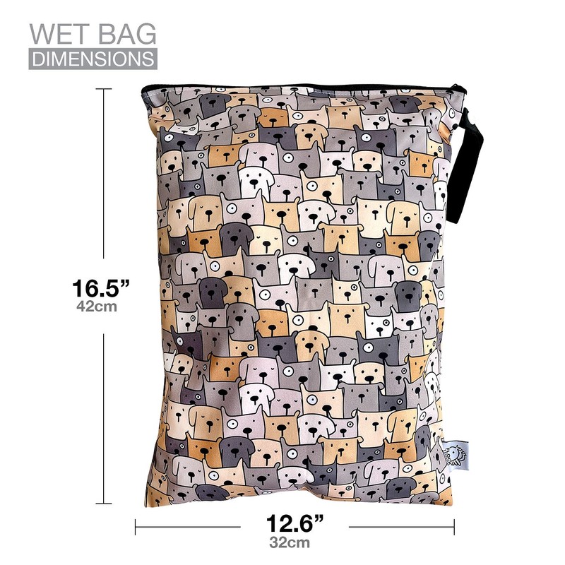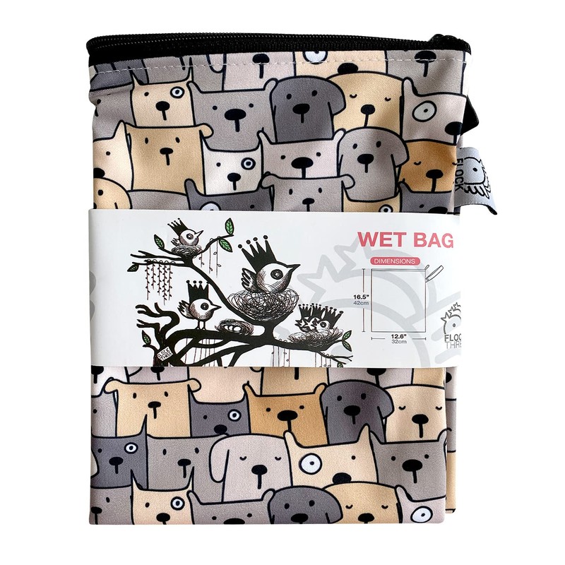 FLOCK THREE Bolsa húmeda lavable y reutilizable para pañales, resistente al agua, bolsa de natación para yoga, gimnasio, 12.6 x 16.5 pulgadas, Lindos perros., Large, Bolsa húmeda