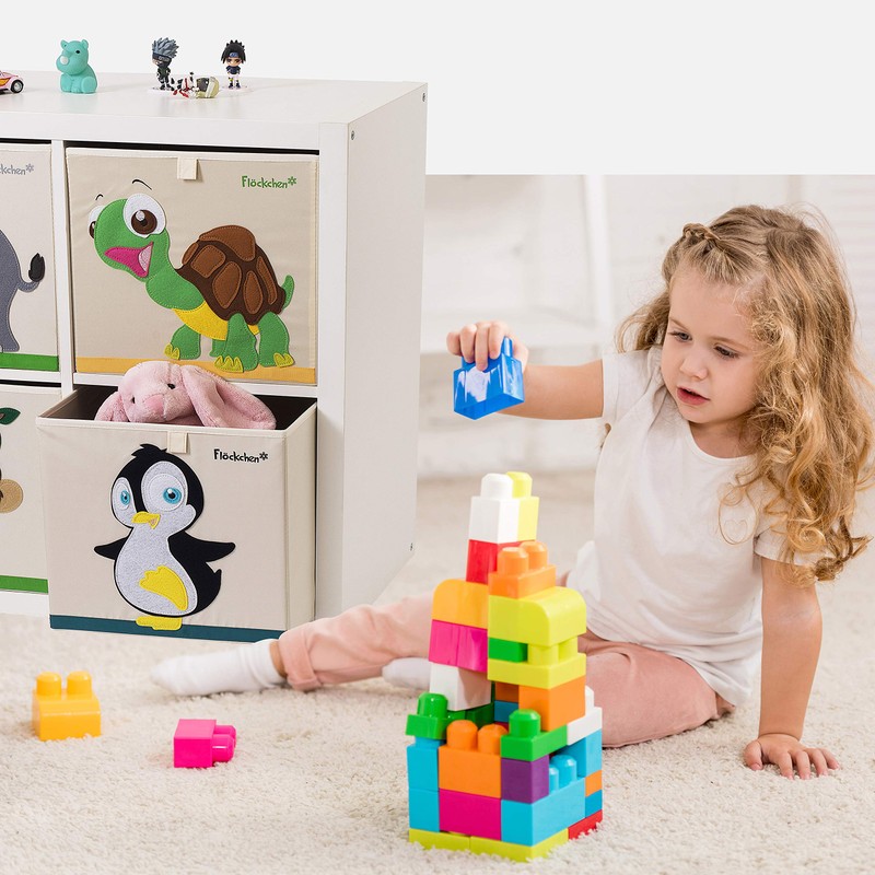 - Imagine a perfectly tidy children's room – thanks to our premium Flöckchen storage boxes, organising toys and clothes is easy by hand. So we banish the chaos from the children's room and also set decorative optical eye-catchers. In addition, the box fits perfectly into all standard cube shelves (33 x 33 x 33 cm). Try our Flöckchen box as an insert in the Kallax shelf.
