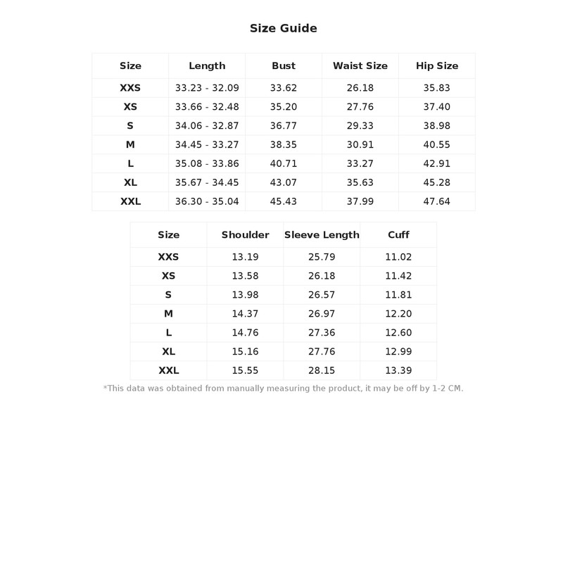 XL: Brustumfang: 100 cm, Manschette: 33 cm, Hüftumfang: 114 cm, Länge: 80 cm, Schulter: 39 cm, Ärmellänge: 70 cm, Taille: 80 cm.