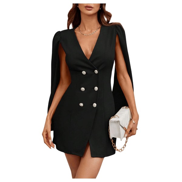 Floerns Damen V-Ausschnitt Zweireihiger Cape Blazer Split Sleeve Elegant Blazer Kleid, Schwarz, L