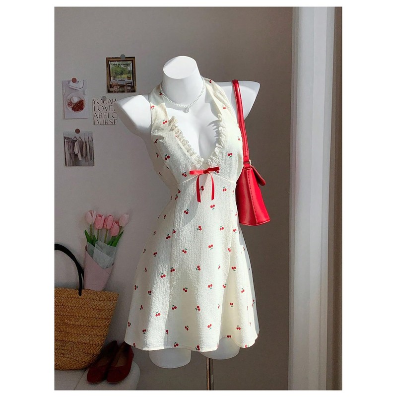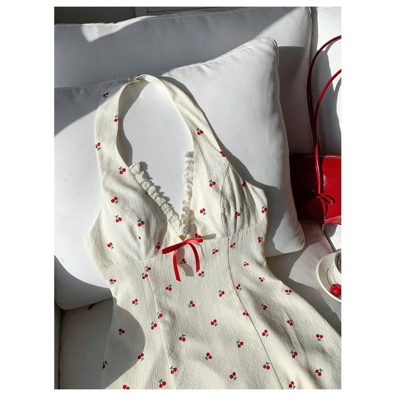 - Feature: Cherry print, bow, backless, sleeveless, flared, frill, mini, halter neck dress for women, girly dress for women