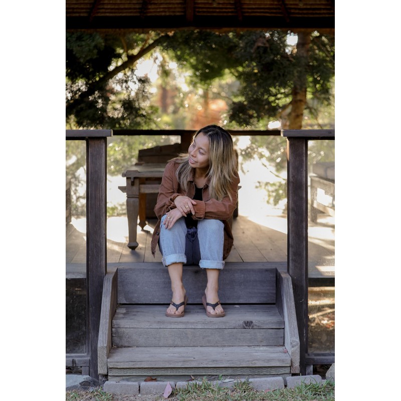 - Rubber sole with faux leather strap