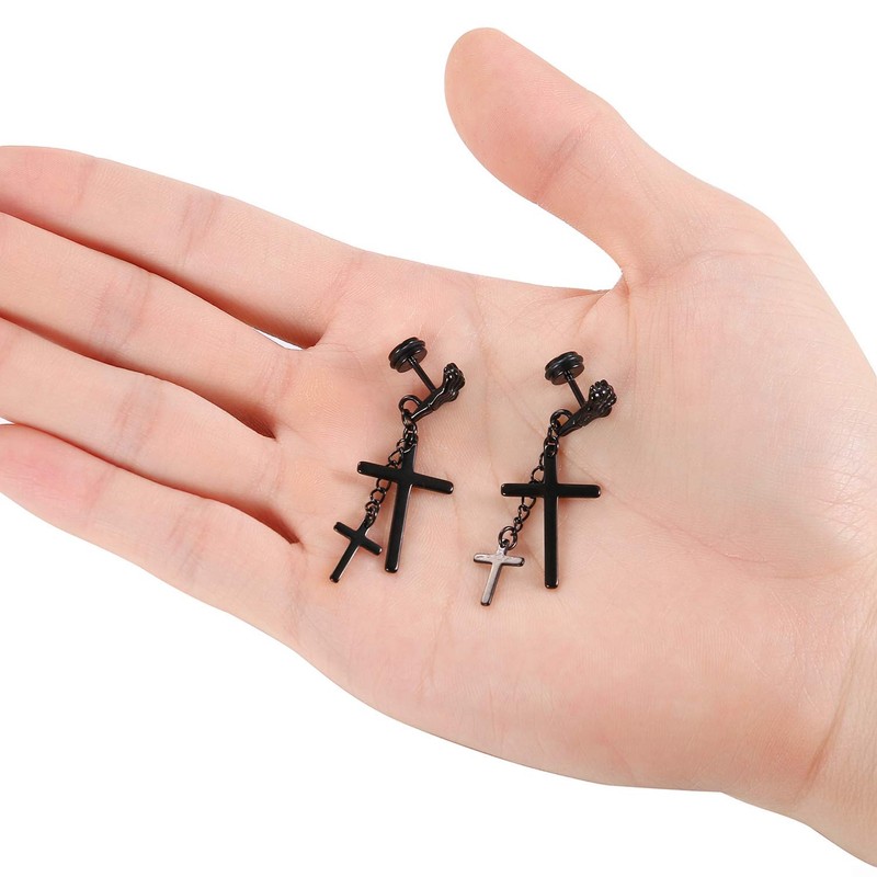 Flongo Men's Women Gothic Stainless Steel Black Cross Dangle Stud Earrings, Skull Skeletone Hand Claw Dangle Earrings, Vintage Cross Chain Stud Earrings Drop Dangle