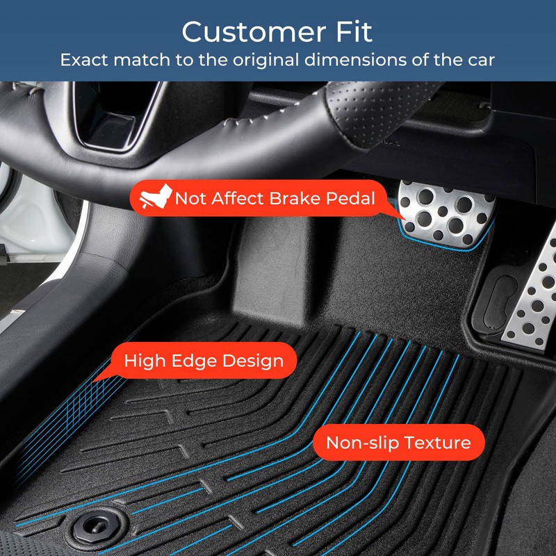- Integrated Molding Process: The use of 3D code scanning integrated injection molding technology allows for more detailed designs for each floor mat in the car, ensuring maximum precision and coverage. Featuring a high-edge design and high-density surface protrusion structure, it provides precise edge-to-edge adhesion (better than carpets or ordinary footpads), ensuring maximum prevention of dirt, mud, and spills