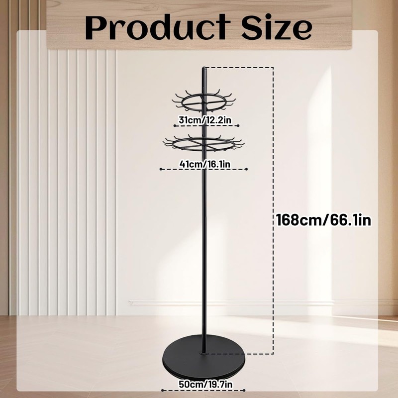 • CONVENIENT SMART STORE RACK DESIGN: Our belt scarf holder stands 66 inches tall to ensure that your belts, ties, waistbands and more don't touch the ground. Carefully designed extension hooks prevent slippage while maximizing space efficiency with a small 19.7-inch base, combining style and function to showcase a neat two-tier design.