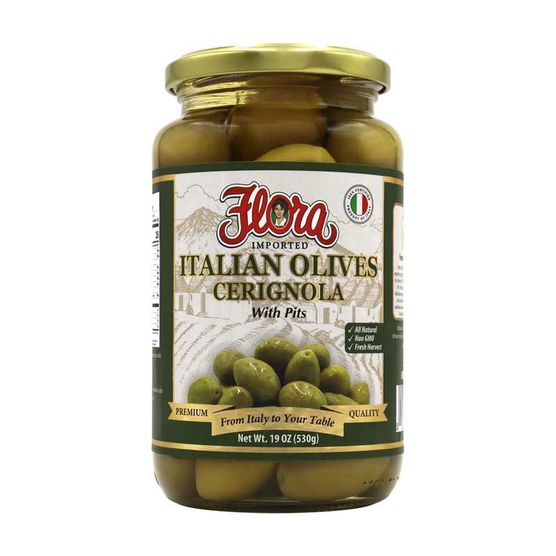 - Flora Foods Italian Olives Cerignola with Pits: Indulge in the authentic flavor of Cerignola Olives, handpicked from Italy and left intact with their pits for a truly traditional experience.