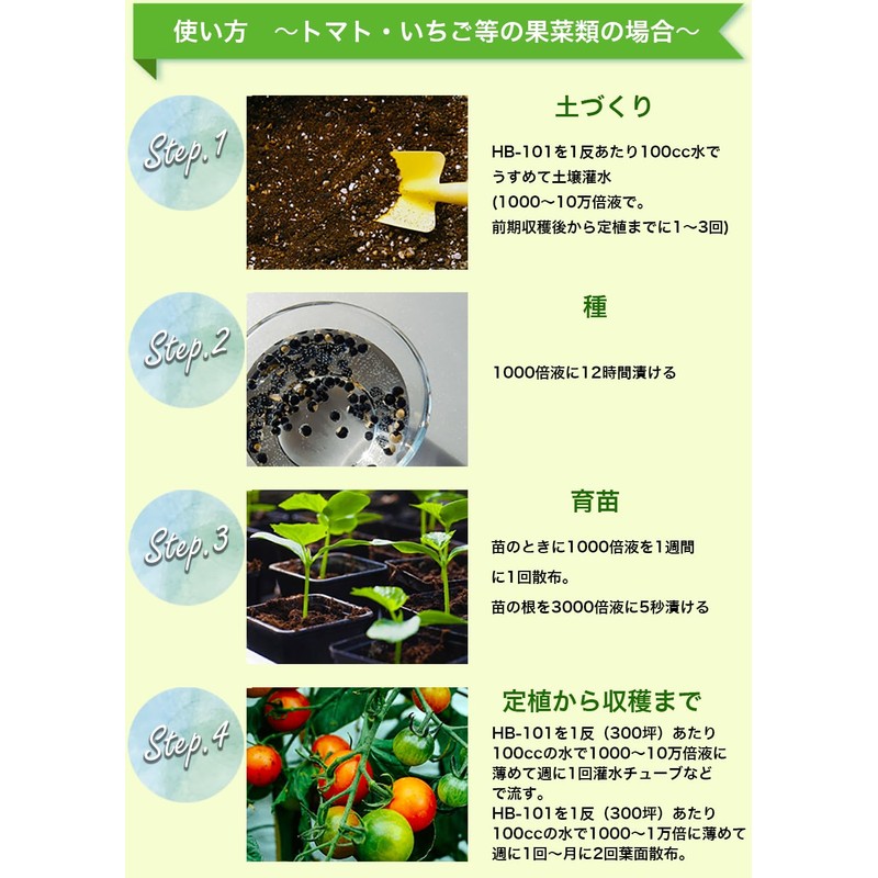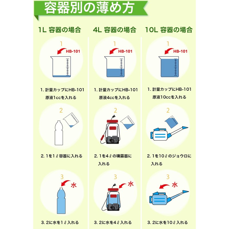 - Solution (dilution type): 1 ml of undiluted solution per 3 tsubos (10 square meters) is diluted more than 1,000 times with water and used for soil (root) and leaves. For planting pots, planters, etc., dilute with 2-3 drops per 0.6 gal (2 L) of water