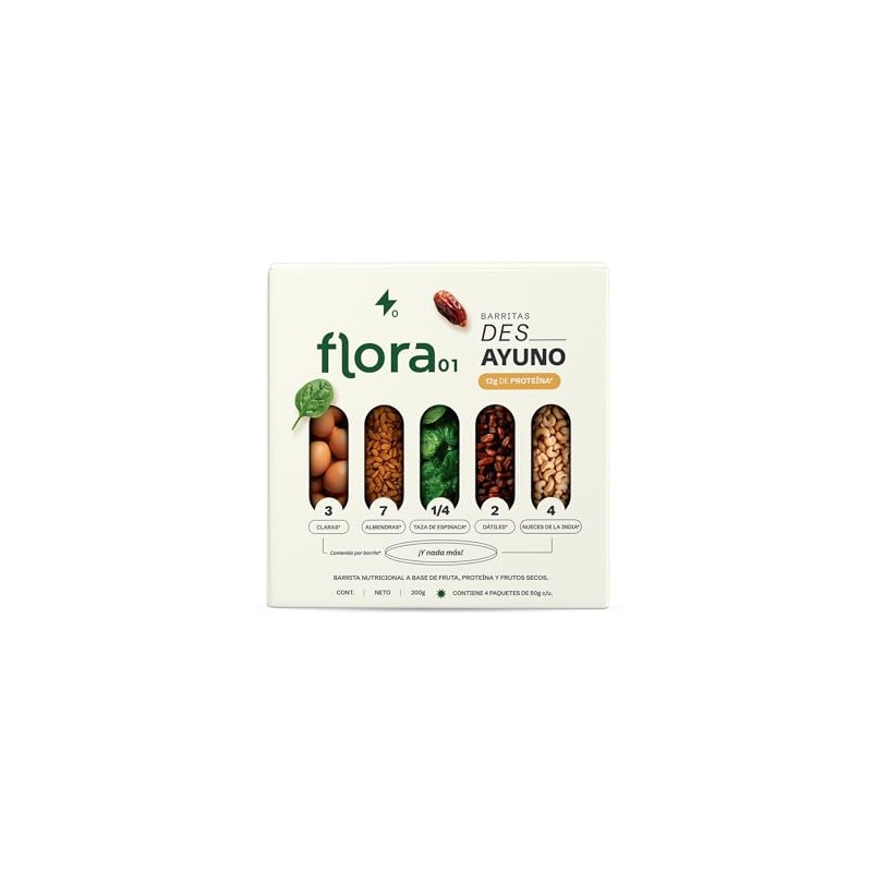 FLORA01, Barras de protena Des__Ayuno, Sabor natural, Libre de sellos, 12 gr de protena por barra, Caja con 4 piezas