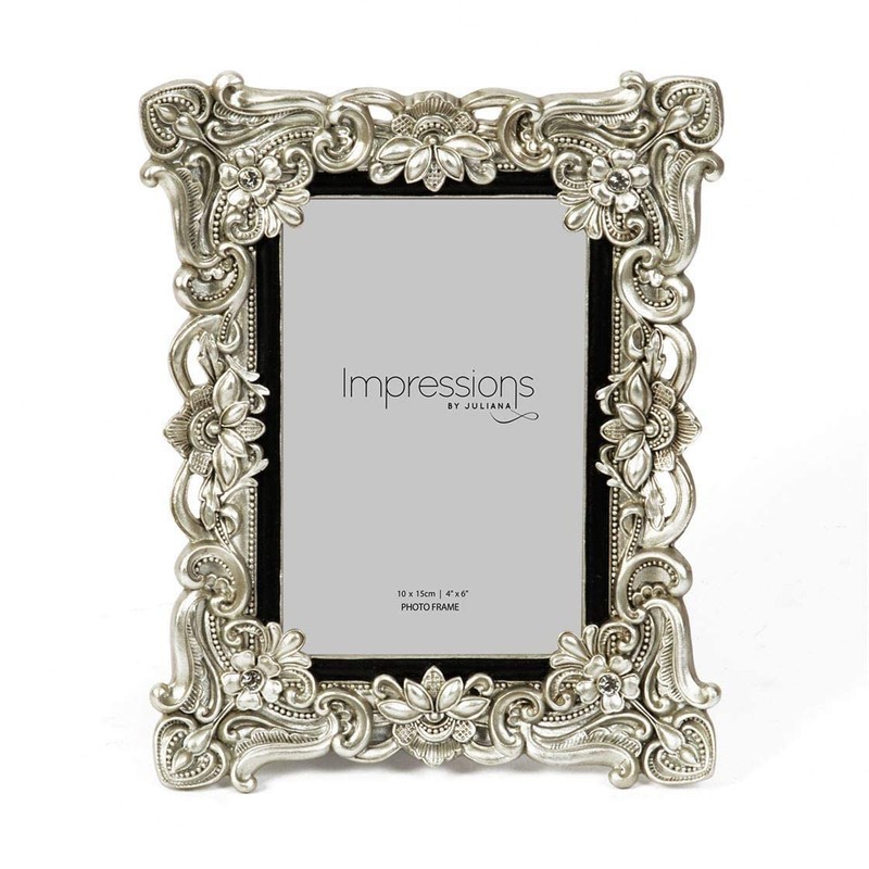 A beautiful antique effect silver photo frame from Impressions by Juliana. The frame measures 4' x 6' and has a gorgeous floral design embellished with crystals to create a gorgeous antique finish.