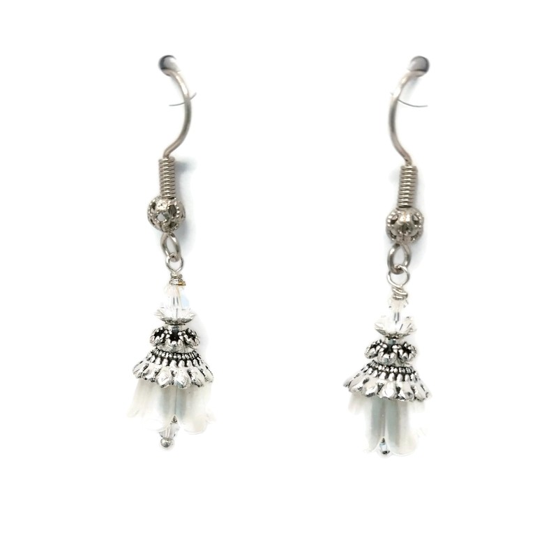 Floral Dangle Earrings in White with silver and crystal accents on Surgical steel French hooks