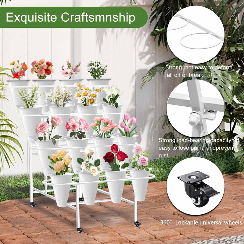 Floral Display Stand with 16 White Flower Baskets 4-Layers Cart Display Stand with Wheels ,Sturdy Mobile Flower Bouquet Rack for Courtyard, Garden, Flower Shop, with Lockable Rotating Wheels (White)