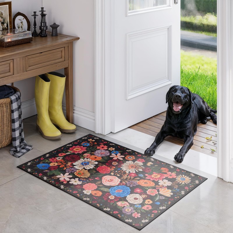 Floral Rug for Entryway, 2x3 Washable Kitchen Mat Ultra-Thin Soft, Non-Slip Indoor Door Carpet Stain Resistant Boho Small Low-Pile Throw for Bathroom Bedroom (2 x 3, Black Garden)