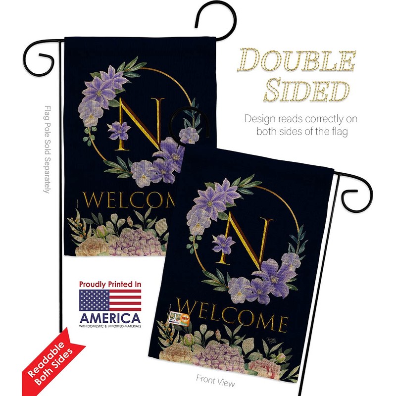 Floral Welcome N Initial Burlap Garden Flag Set Wood Dowel Monogram Spring Sunflower Tulip Rose Orchid Lilies Season Springtime Flower Wreath Small Gift Yard House Banner Double-Sided 13 X 18.5