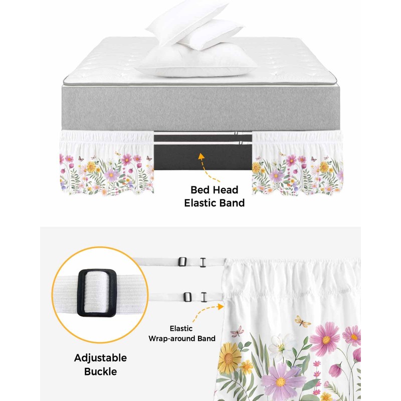 Florals Butter-Fly Bed Skirt Queen Size 16 Inch Drop, Adjustable & Elastic Wrap Around Bed Skirts Pleated Luxury Dust Ruffles for Twin Full Queen Cal King Base Bed, Spring Summer Flower Leaves