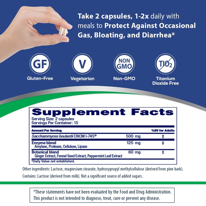 Take charge of your gut with our unique yeast-based probiotic strain that restores digestive balance.* Crafted with a proprietary blend of digestive enzymes for women and men, plus botanicals, our formula strengthens immune and digestive health while protecting against occasional gas, bloating and diarrhea. *