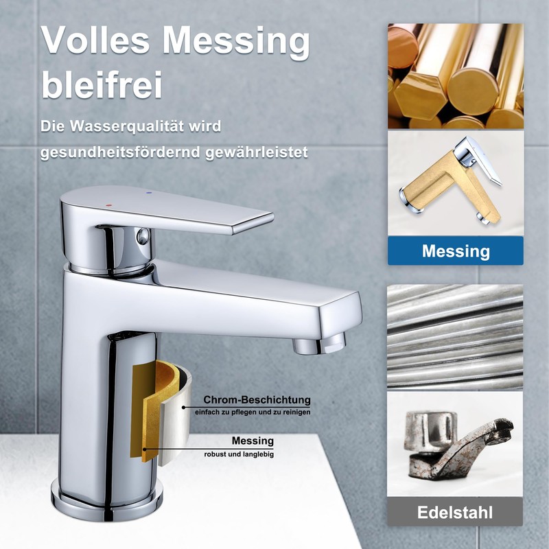 • Sturdy and durable: the basin mixer tap is made of strong and durable brass to resist corrosion, rust and scratches. This complies with DIN standards and the German drinking water regulation. For even more safety, the connection hoses are KTW certified.