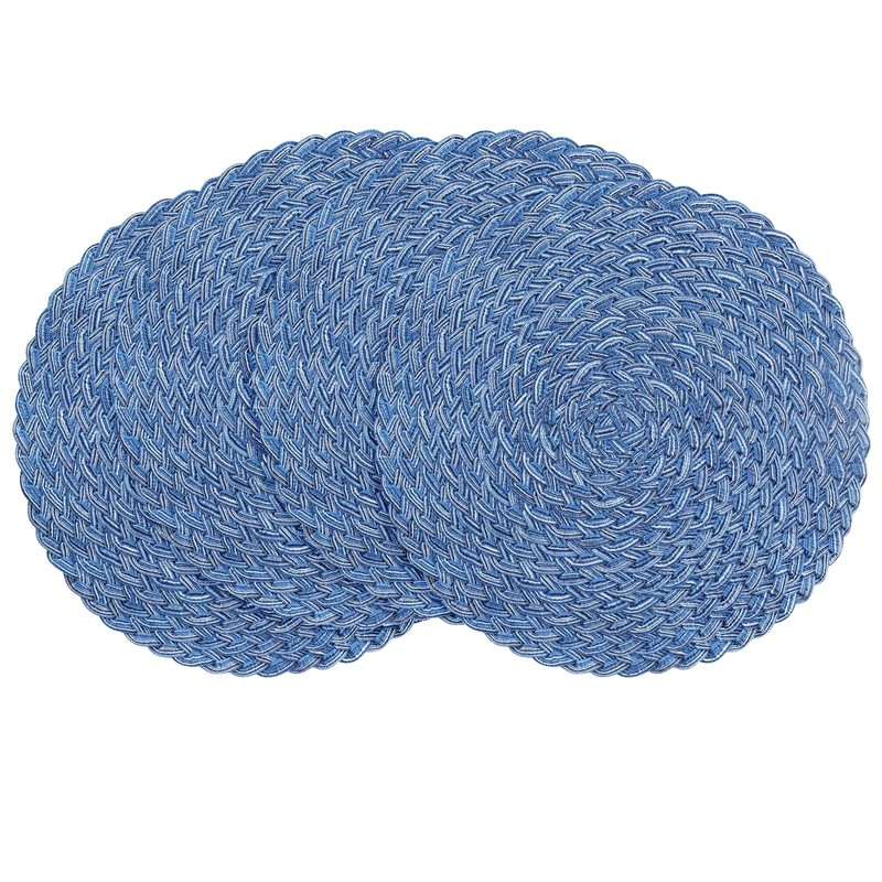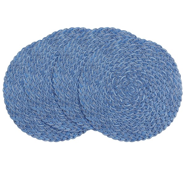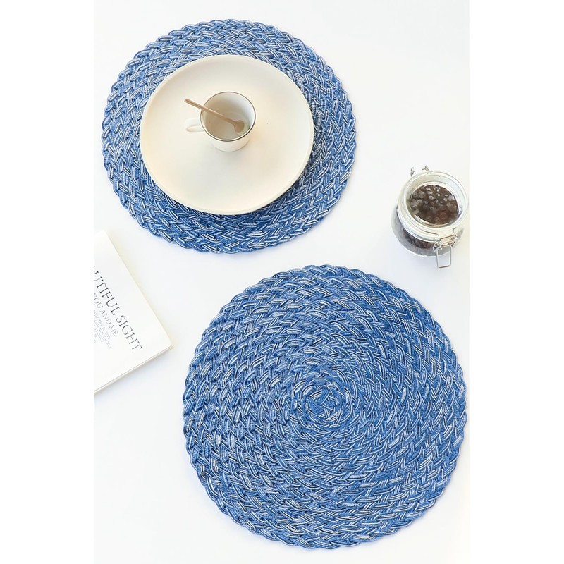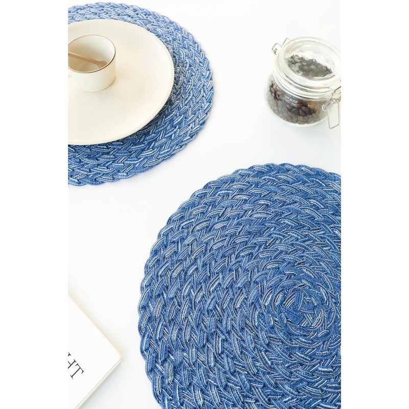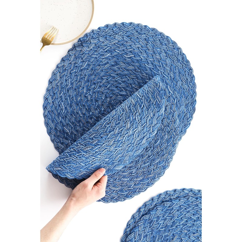 Floroom 15 Inch Round Braided Placemats Set of 4, Washable Heat Resistant Cotton Polyester Circle Boho Place Mats for Kitchen Dining Table - Seascape Blue