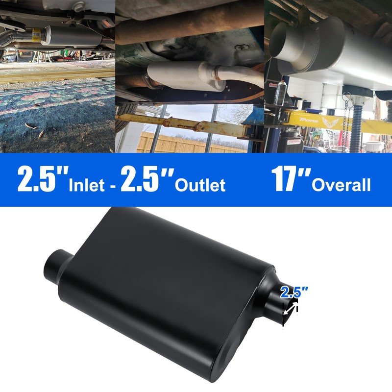 - Performance Muffler size--2.5" offset in (ID) 2.5" offset out (ID) | Body Length: 13"| Overall Length: 17"| Body Height: 4" | Body Width: 10"