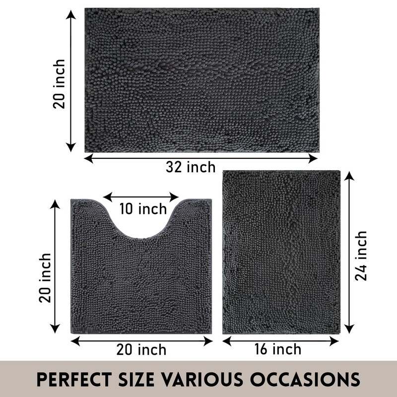 Flotstiga Bathroom Rugs Chenille, Extra Thick and Absorbent, Non-Slip, Machine Washable, Dry Quckily, Soft Cozy Plush, Used Under Shower Bathtub and Sink, Bath mat Sets 3 Piece(Dark Grey)