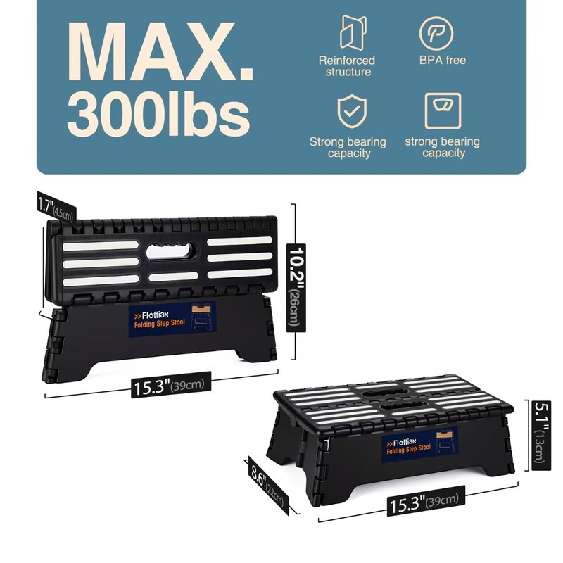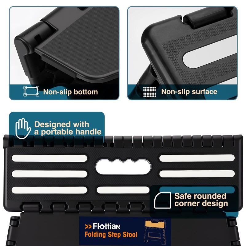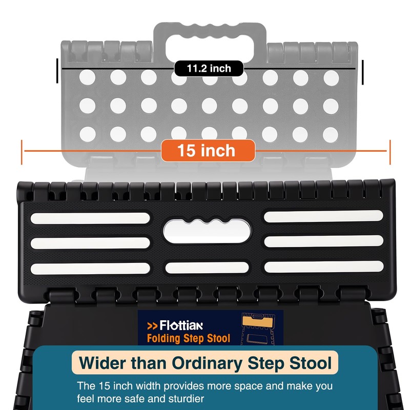 Flottian 5" Folding Step Stool for Adults and Kids 15-Inch Extra Wide Stool Holds Up to 300 lbs,Non-Slip Folding Stools with Handle,Compact Plastic Foldable Step Stool for Bathroom,Kitchen,ect Black